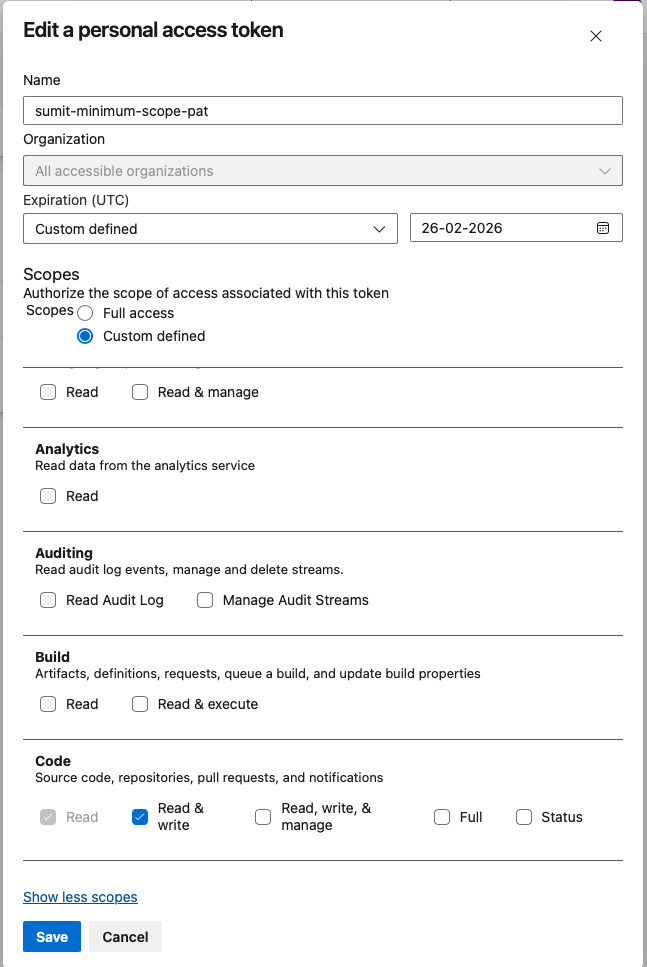 Important: Token must be created by an Azure DevOps Organization Owner or users with the "Manage organization webhooks" permission, who are authorized to manage organization webhooks. Although other Azure users may be able to select the scope requirements when creating a token, the token will not work due to permission requirements in Azure to manage organization webhooks.