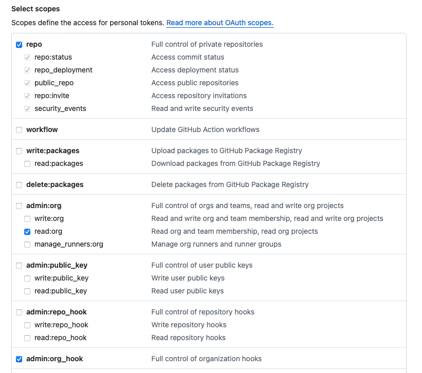 8. Under Select scopes, select repo (all), read:org (under admin:org), and admin:org_hook.