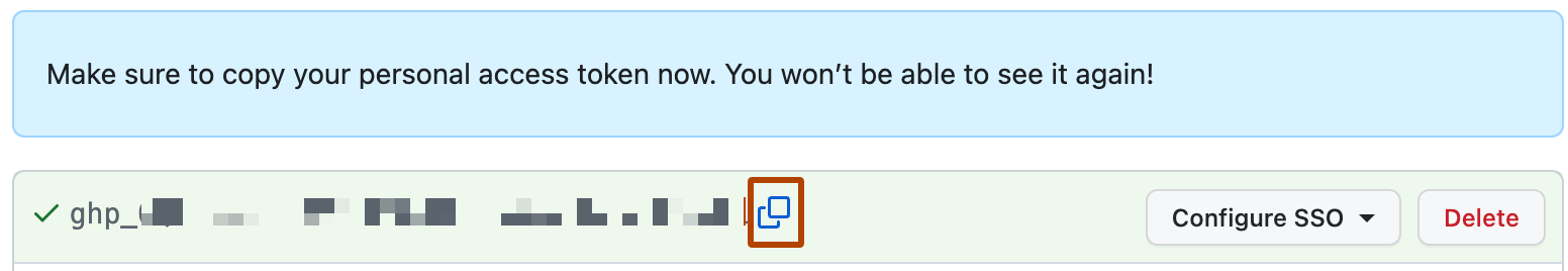 11. To use your token to access resources owned by an organization that uses SAML single sign-on, authorize the token via Configure SSO. For more information, see Authorizing a personal access token for use with SAML single sign-on in the GitHub Enterprise Cloud documentation.
