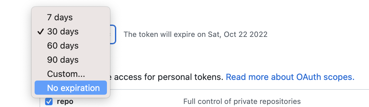 7. Set the token's expiration date. To avoid issues, we recommend No expiration.