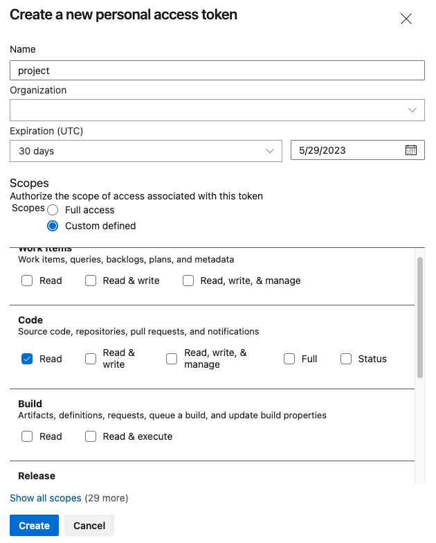 - Enable the Read scope (under Code).