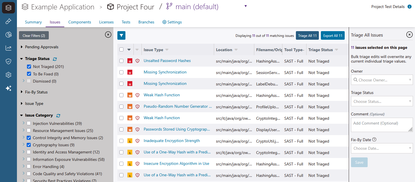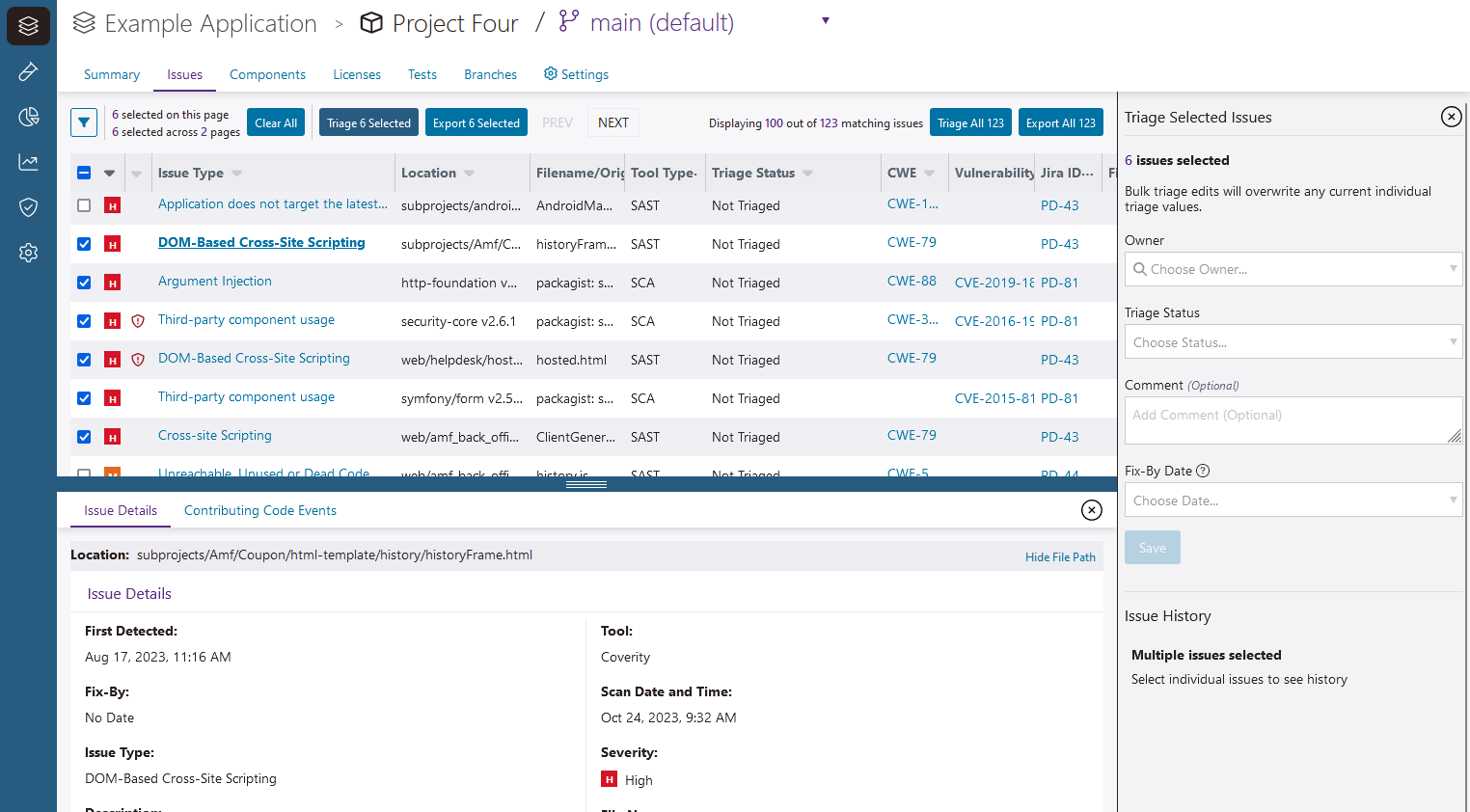 • If the same issue is detected in multiple branches of a project, you only need to triage it once. Triage actions (which can include setting or changing fix-by dates) are automatically applied across branches in a project.