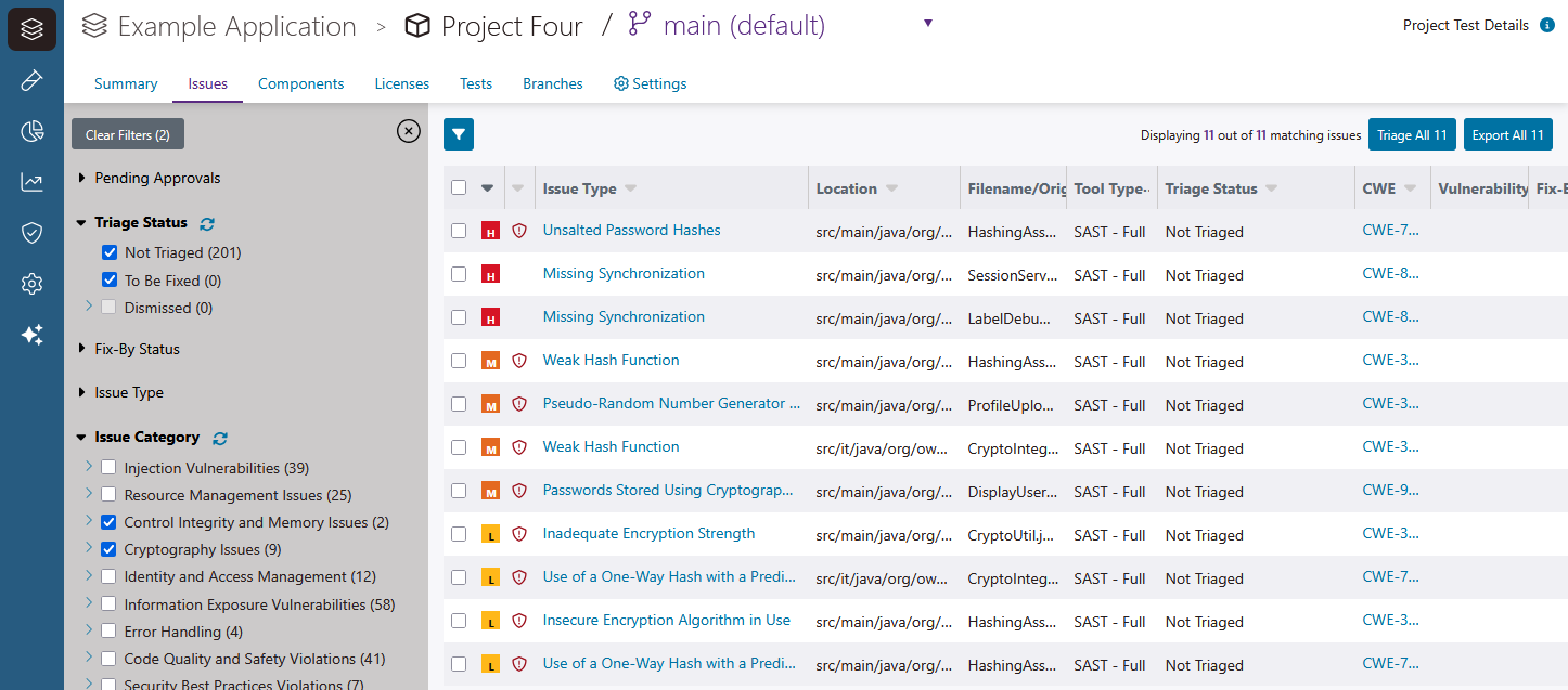 Important: Duplicate SCA issues may appear in the issues table. This occurs when the same issue is captured in separate package manager and signature analysis tests of the same branch. Duplicate SCA issues must be triaged separately.