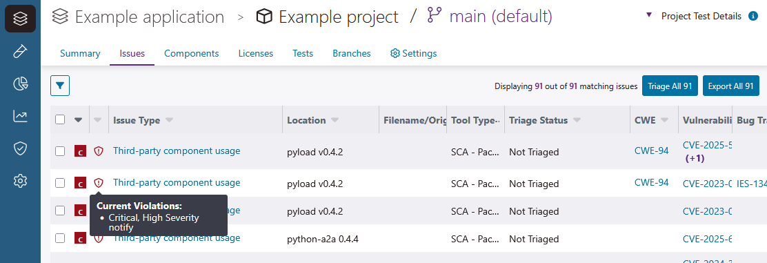 On the Issues tab, a policy status icon appears next to issues that violate issue policies. Hover over the policy status icon to view the names of issue policies an issue violates.
