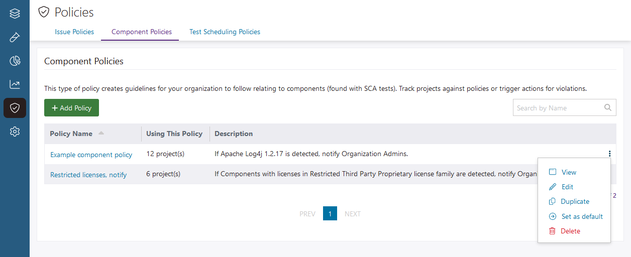 Component Policies tab Create and manage component policies that instruct Polaris to perform actions when components with specific properties are detected in SCA tests. Note: See Component policies for more information.