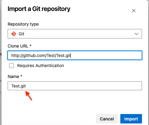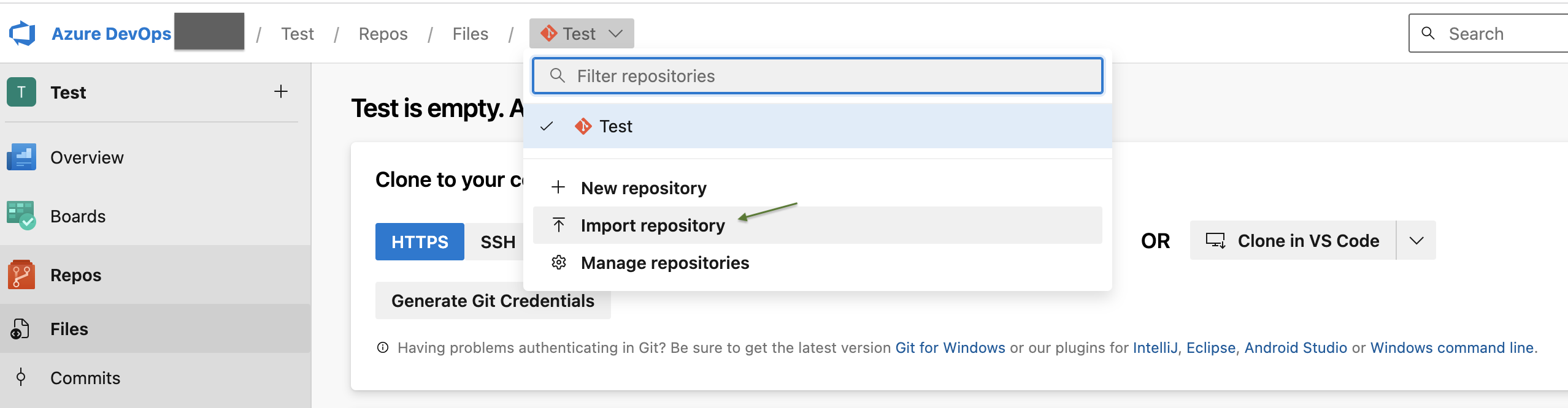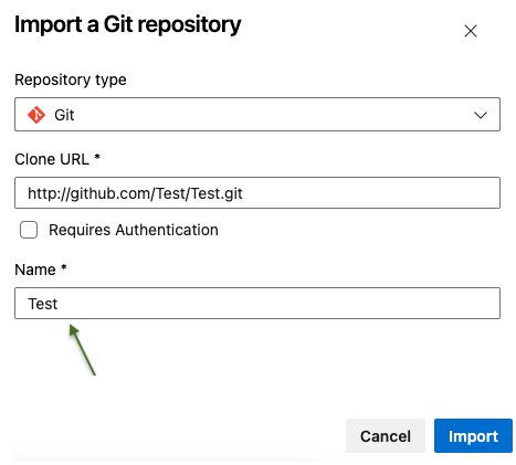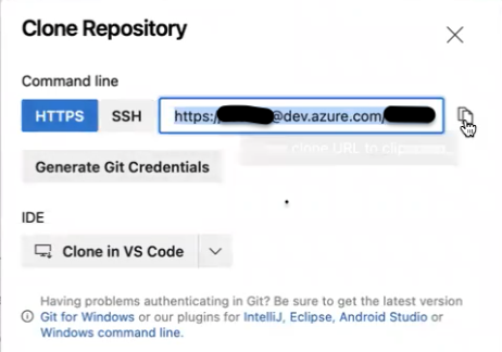 - Enter the Repository URL. To obtain the repository's URL, open your Azure project, click the Clone button, copy the HTTPS URL (SSH is not supported).