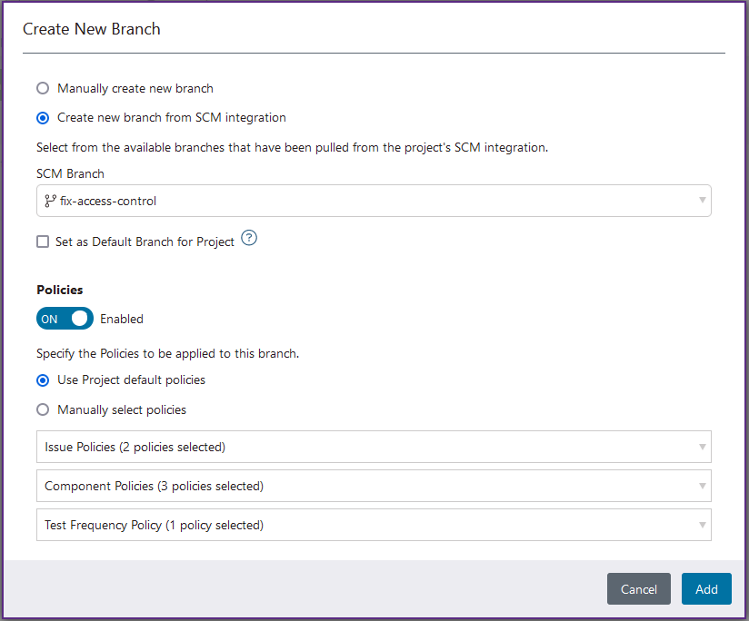 Follow these steps to add a branch to a SAST & SCA project. By default, each project can include up to 10 branches.