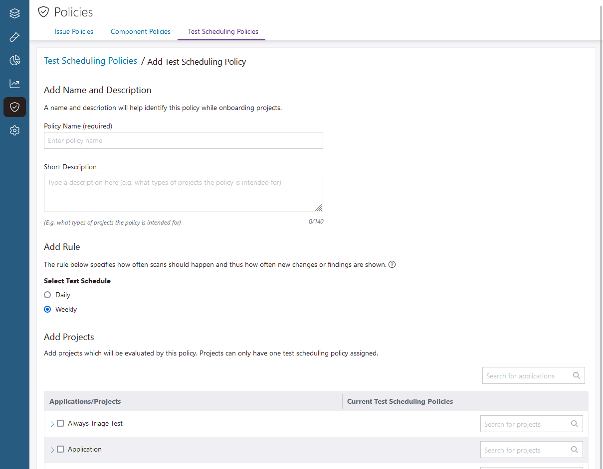 Important: If you assign a test scheduling policy to a project or branch that isn't connected to an SCM repository, it will not function as expected. Before you use test scheduling policies, set up an SCM integration, and import branches from your repository. For more information, see Integrate a SCM Repository to a Project and Create and manage branches in a project.